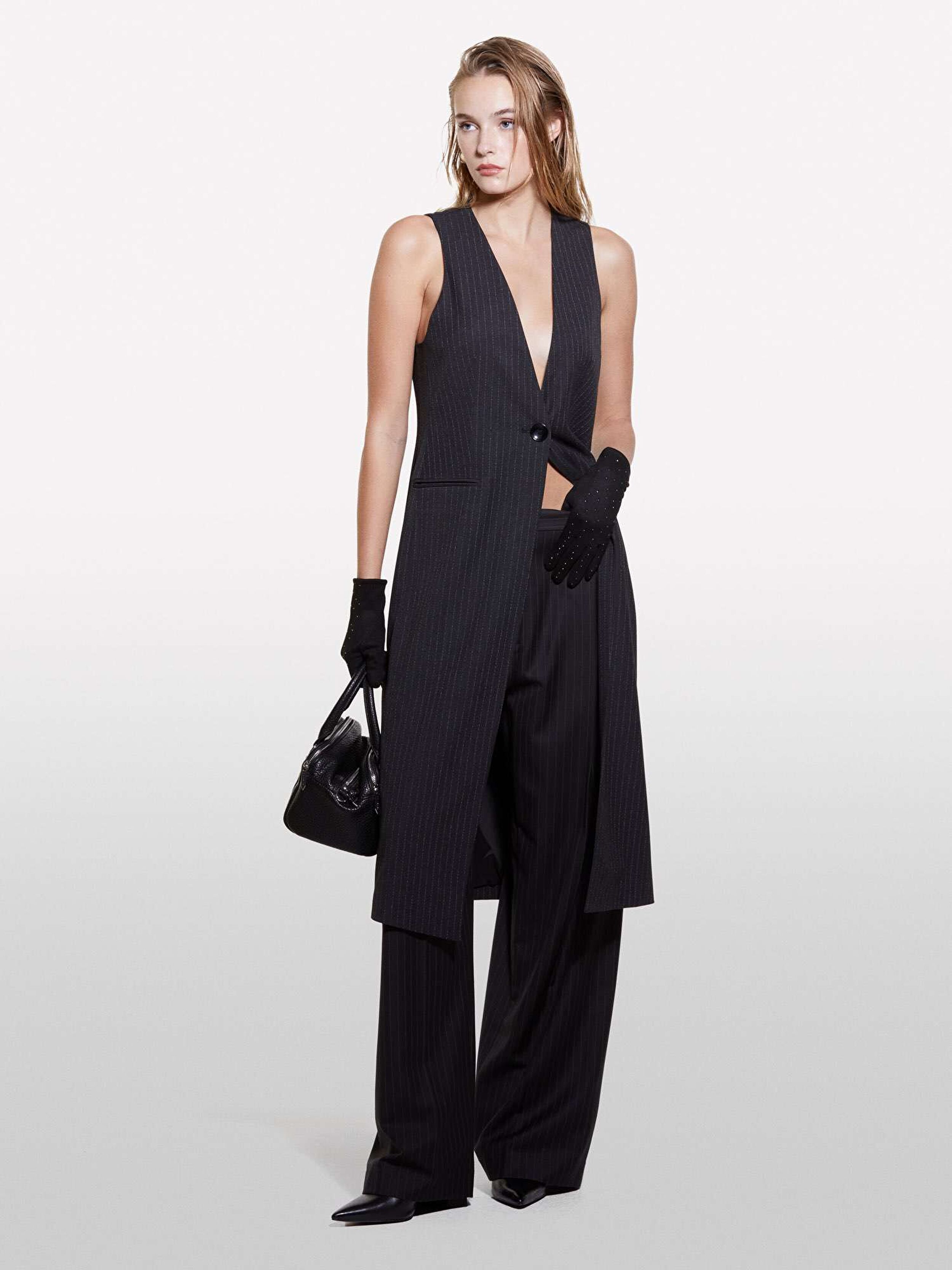 Kadın Antrasit Viskoz Karışımlı Tek Düğmeli Yanları Şerit Cepli Uzun Yelek