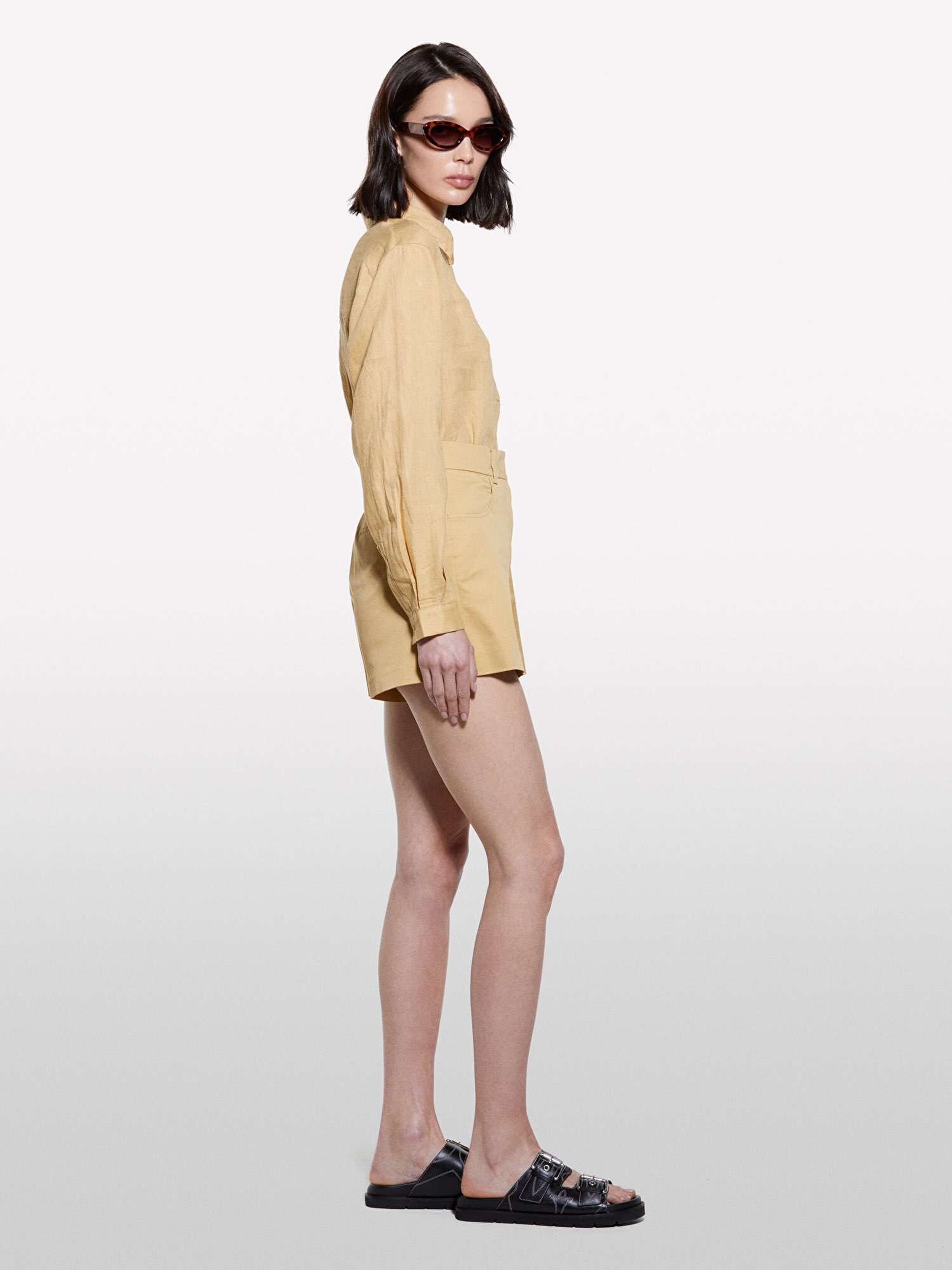 Kadın Kese Kağıdı %100 Keten Düğmeli Göğüs Cepli Uzun Kollu Gömlek 325P5BMLLQ06S-303